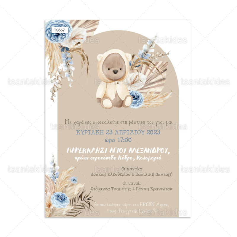 Προσκλητήριο βάπτισης για αγόρι με θέμα αρκουδάκι Boho Teddy Bear TS557.