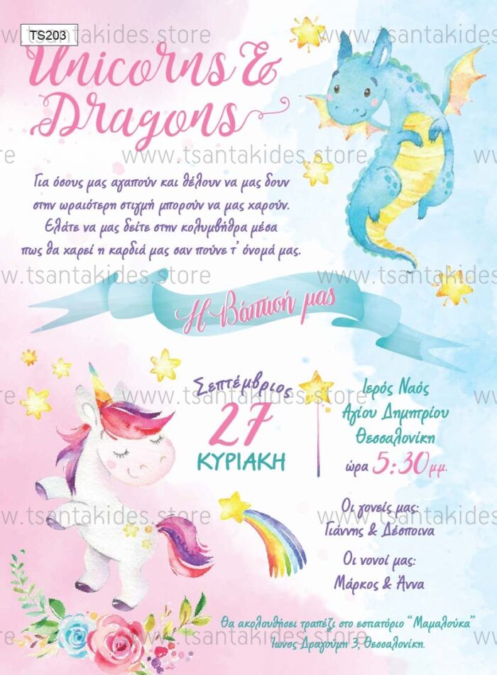 Προσκλητήριο βάπτισης για δίδυμα με θέμα τον μονόκερο και τον δράκο TS203