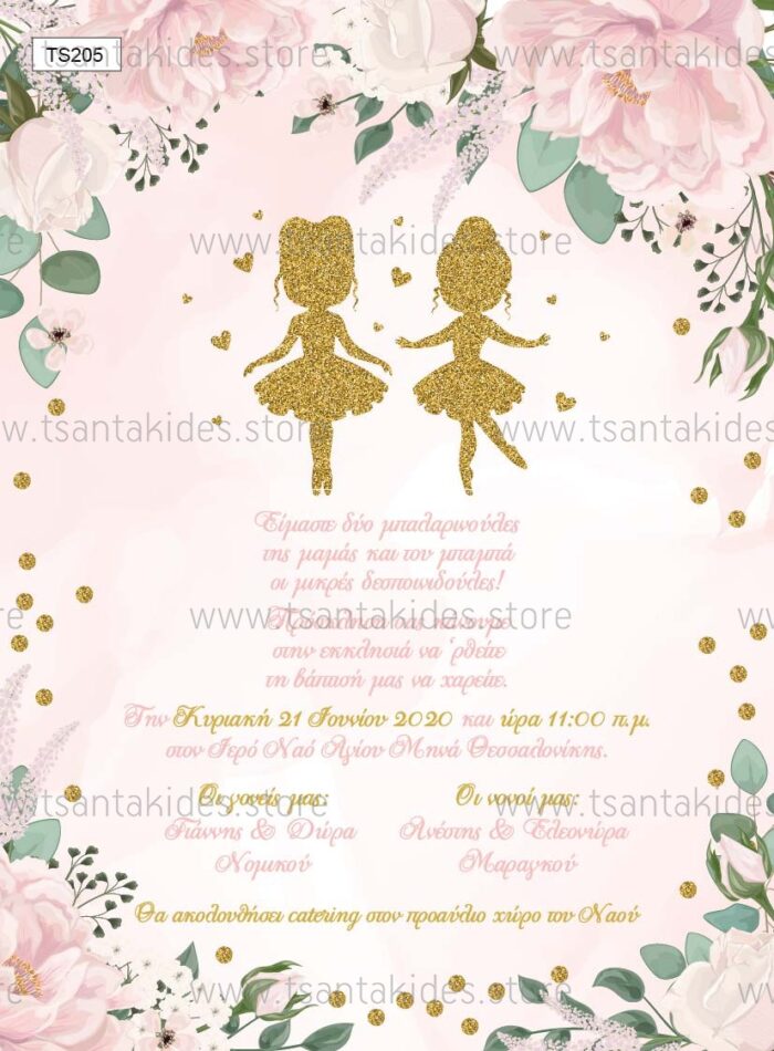 Προσκλητήριο βάπτισης για δίδυμα με θέμα την μπαλαρίνα TS205