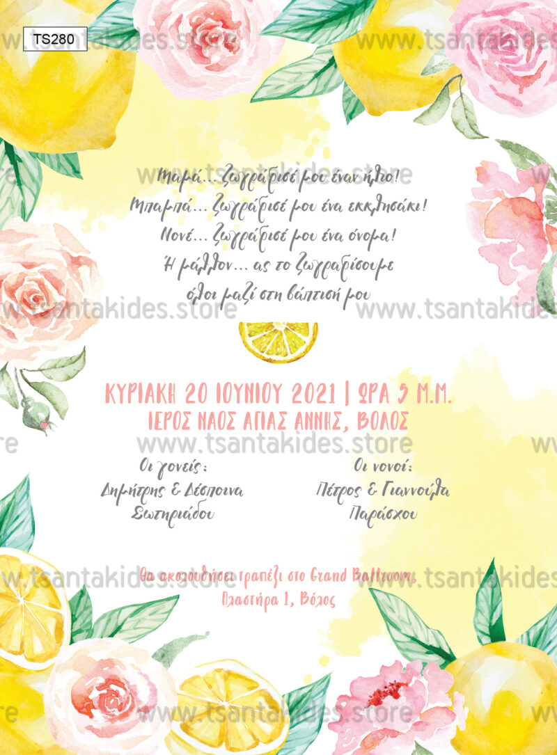 Προσκλητήριο βάπτισης για κορίτσι με θέμα λεμόνι – sweet lemon TS280