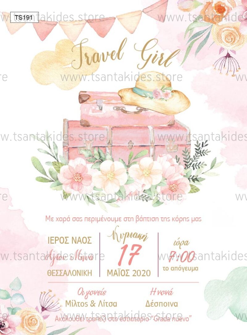 Προσκλητήριο βάπτισης για κορίτσι με θέμα ταξίδια travel girl TS191