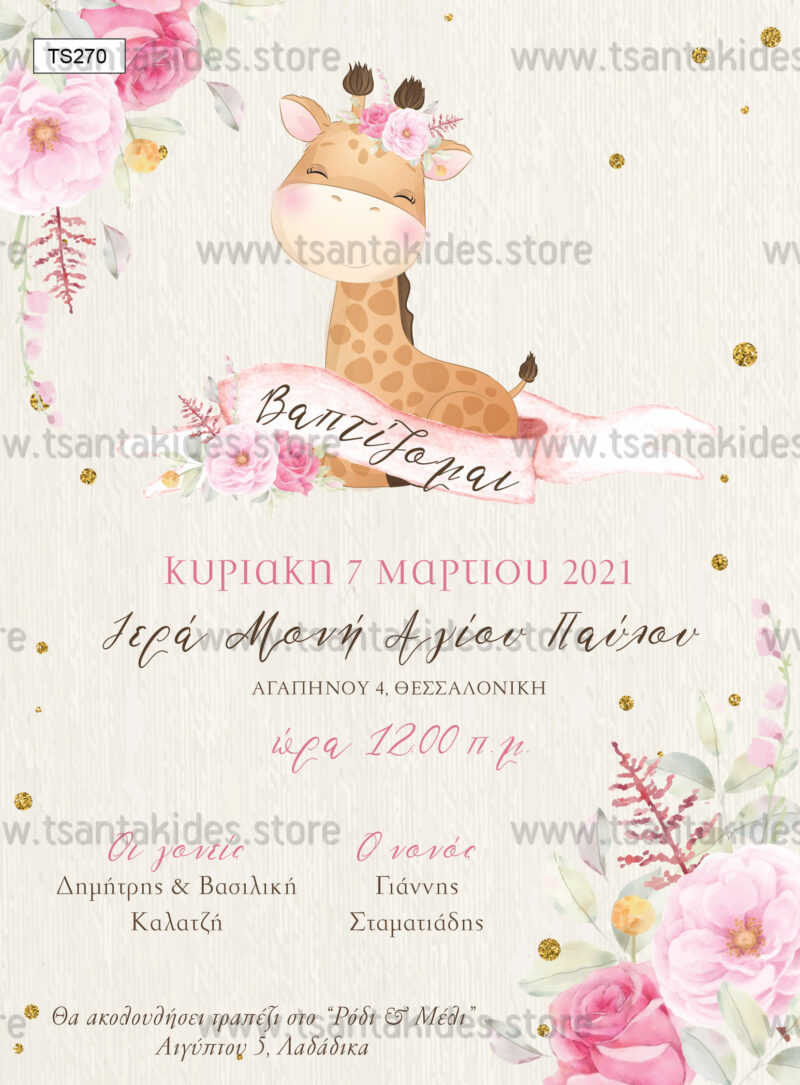 Προσκλητήριο βάπτισης για κορίτσι με θέμα τη μικρή καμηλοπάρδαλη TS270