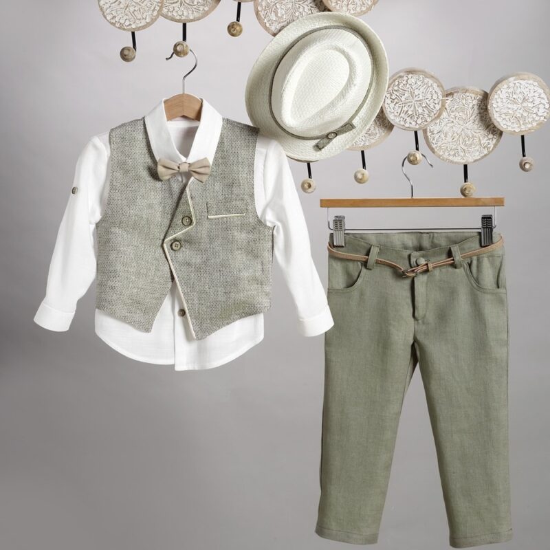Βαπτιστικό ρούχο με μπεζ ραμί παντελόνι, εκρού βαμβακερή πουκαμίσα και βεραμάν καμπαρντίνα γιλέκο New Life 2911-2