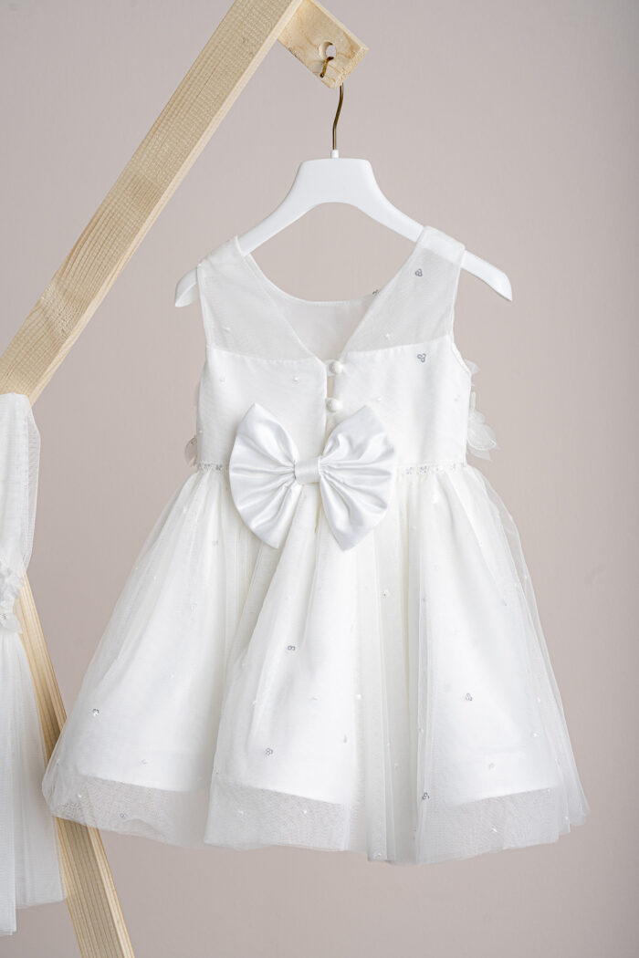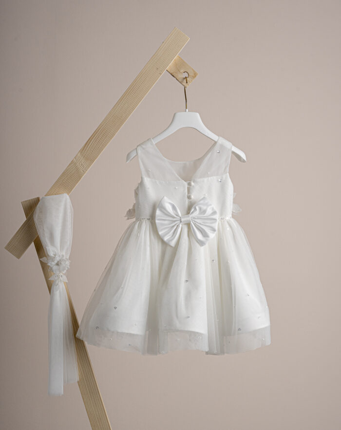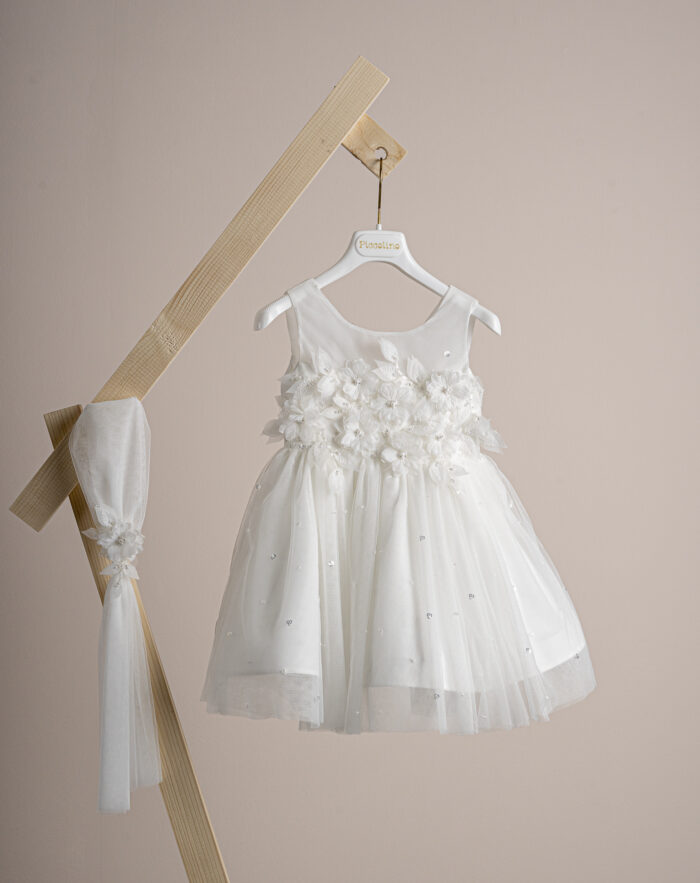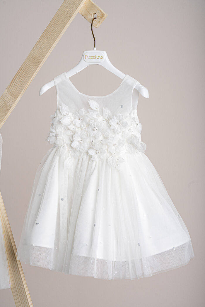Βαπτιστικό φόρεμα Piccolino Jessica Ivory, Φόρεμα μεσάτο με μπούστο δύο επιπέδων, στο ύψος των ώμων ελαφριά διαφάνεια με τούλι με ελαφριά παγιέτα, το υπόλοιπο μπούστο είναι διακοσμημένο με μοτίφ από χειροποίητα λουλούδια και ένα υπέροχο διακριτικό με στρας λεπτό ζωνάκι στη μέση. Στο πίσω μέρος καταλήγει σε ένα ελαφρύ V με φιόγκο από σατέν για ντεκορ. Με άκρως εντυπωσιακή φούστα με τούλι με ελαφριά παγιέτα. Το φόρεμα συνοδεύεται από μπαντάνα με ντεκόρ όμοιο με το φόρεμα.