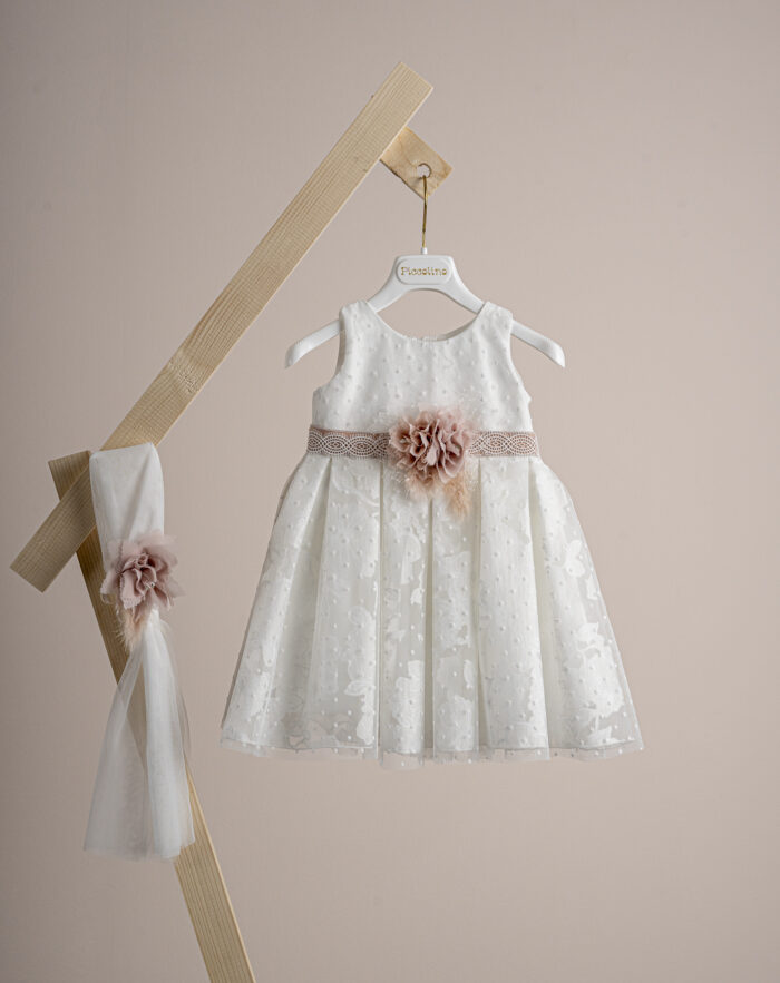 Βαπτιστικό φόρεμα Piccolino Marilita Ivory. Εντυπωσιακό φόρεμα από πουά κεντητό τούλι επάνω από ανάγλυφη δαντέλα. Δαντελένιο ζωνάκι και φούστα με πιέτες. Το ντεκόρ του φορέματος αποτελείται από χειροποίητα λουλούδια και πούπουλα. Το φόρεμα συνοδεύεται από μπαντάνα με ντεκόρ όμοιο με το φόρεμα.
