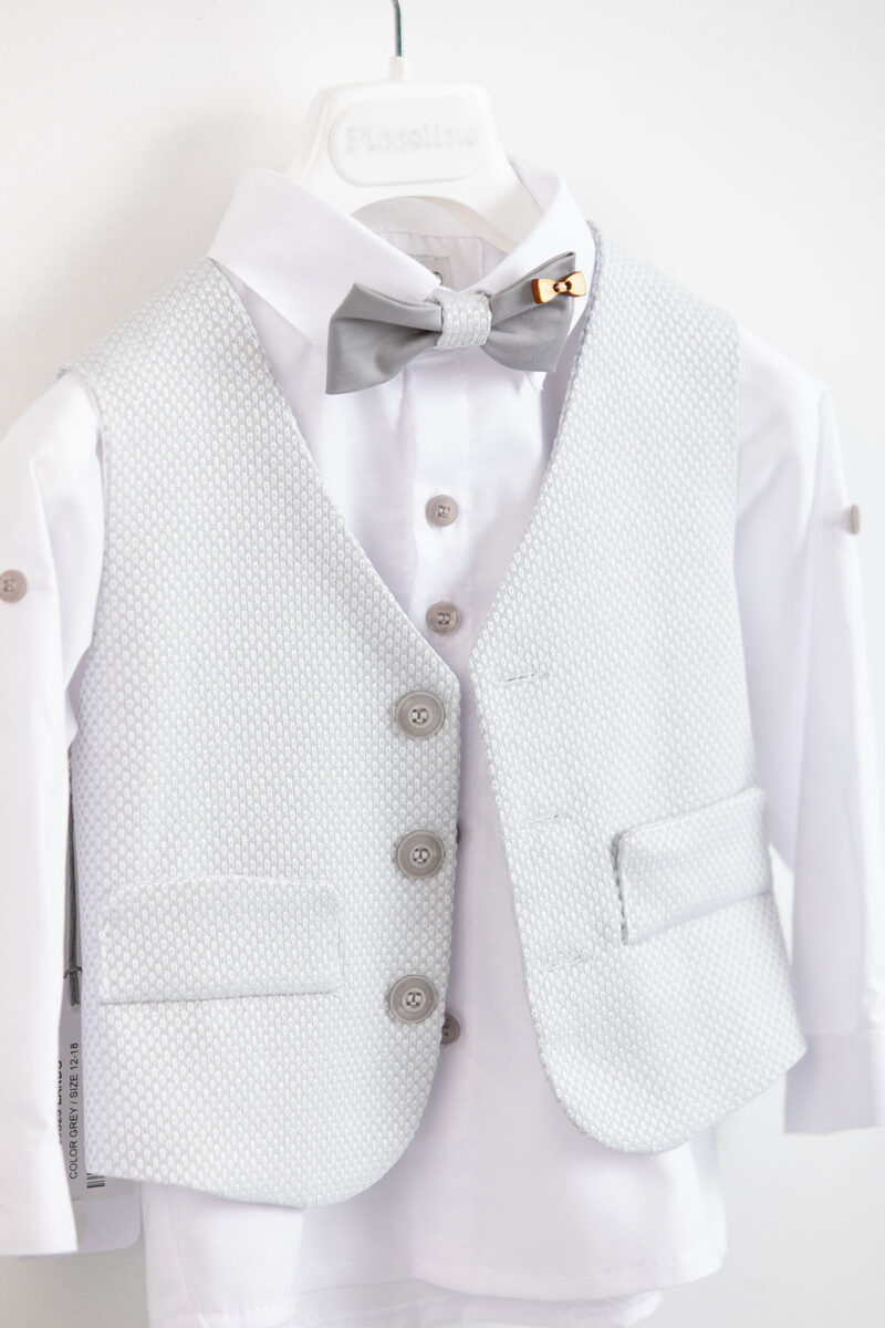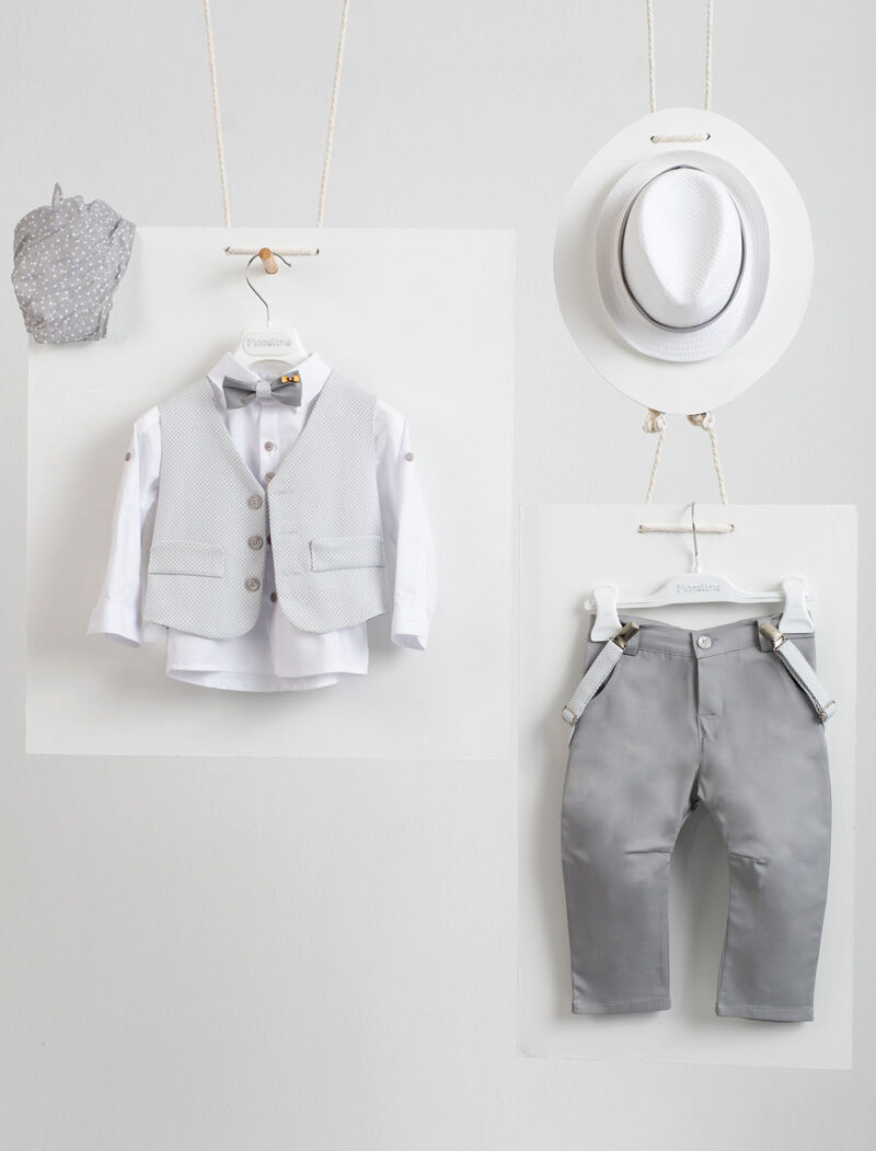 Βαπτιστικό κοστούμι Piccolino Lando σε χρώμα Grey. Περιλαμβάνει γιλέκο γκρι με λεπτομέρειες, πουκάμισο βαμβακερό λευκό oxford, παντελόνι βαμβακερό σε χρώμα γκρι, παπιγιόν με ξύλινη λεπτομέρεια, τιράντες και καπέλο με φάσα.