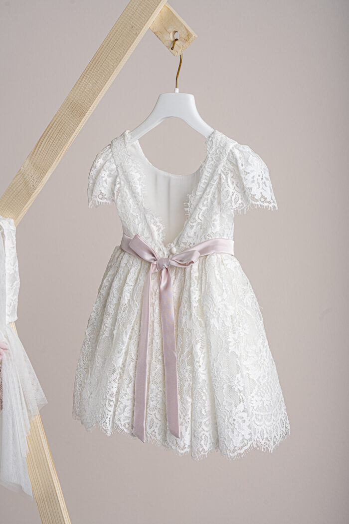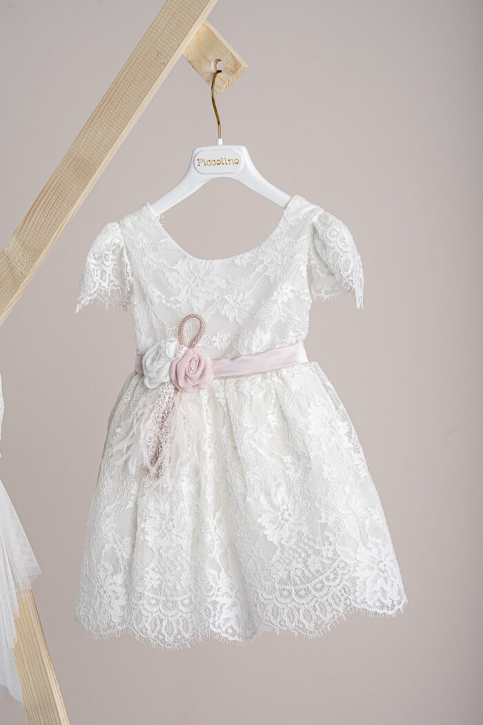 Βαπτιστικό φόρεμα Piccolino Florence Ivory. Φόρεμα μεσάτο με μπούστο από δαντέλα, μανικάκι , ζωνάκι σατέν στη μέση, στο πίσω μέρος καταλήγει σε ένα υπέροχο V με δέσιμο σε φιογκάκι από το σατέν ζωνάκι του. Δαντελένια φούστα με τελείωμα της δαντέλας του. Το ντεκόρ του φορέματος αποτελείται από χειροποίητα λουλούδια, μαραμπού και κορδέλες . Το φόρεμα συνοδεύεται από μπαντάνα με ντεκόρ όμοιο με το φόρεμα.