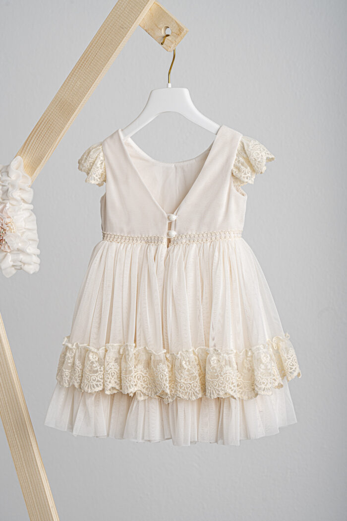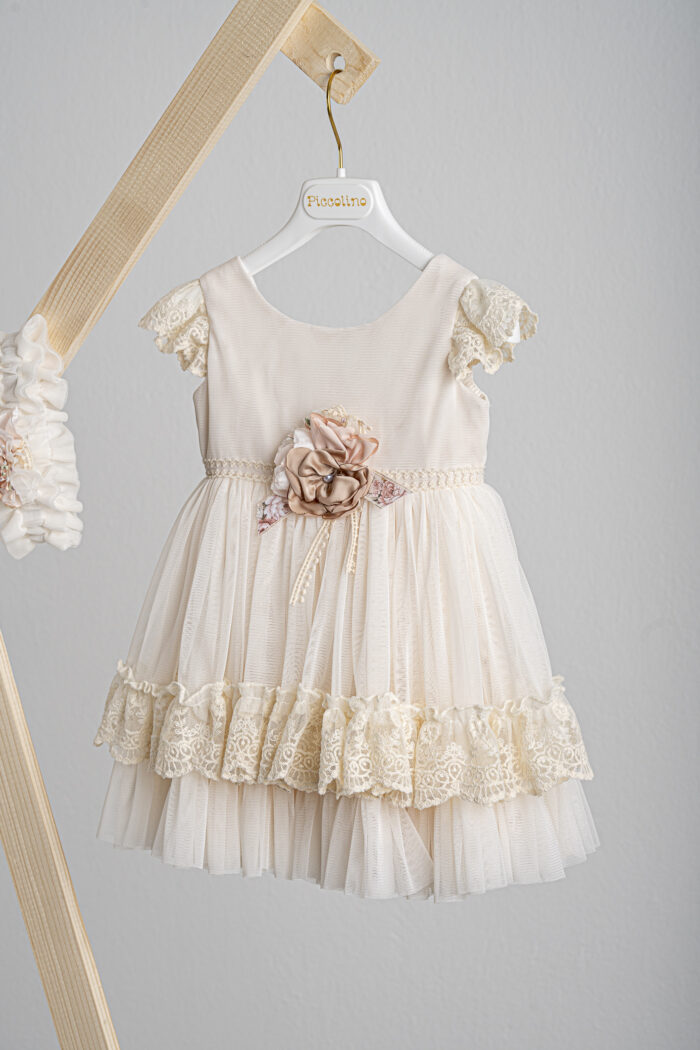 Βαπτιστικό φόρεμα Gabliela Champagne. Φόρεμα μακρύ με μανικάκι από δαντέλα .Φούστα τούλινη δύο επιπέδων με τελείωμα δαντέλας στο πρώτο επίπεδο . Το ντεκόρ αποτελείται από χειροποίητα λουλούδια,. Το φόρεμα συνοδεύεται από κορδέλα με ντεκόρ όμοιο με το φόρεμα.