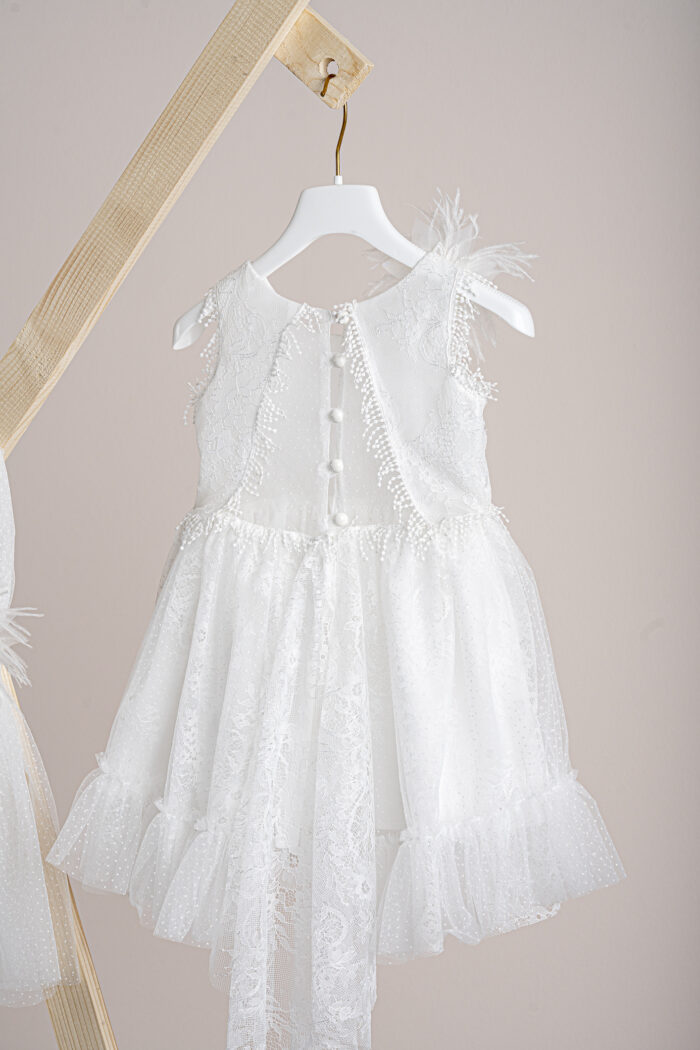 Βαπτιστικό φόρεμα Piccolino Silvia Ivory. Φόρεμα από δαντέλα εξωτερικά και τούλι με ψιλό πουά εσωτερικά. Μπούστο με ιδιαίτερο κόψιμο που καταλήγει σε μύτη μέσα στην φούστα. Ιδιαίτερη πλάτη με εντυπωσιακό άνοιγμα κάνοντας ελαφριά διαφάνεια με το πουά τούλι. Ασύμμετρη φούστα με βολάν, μακριά στο πίσω μέρος. Δαντέλα με κρόσια διακοσμεί τα τελειώματα στο μπούστο. Το ντεκόρ του φορέματος αποτελείται από χειροποίητα λουλούδια και πούπουλα μαραμπου. Το φόρεμα συνοδεύεται από μπαντάνα με ντεκόρ όμοιο με το φόρεμα.