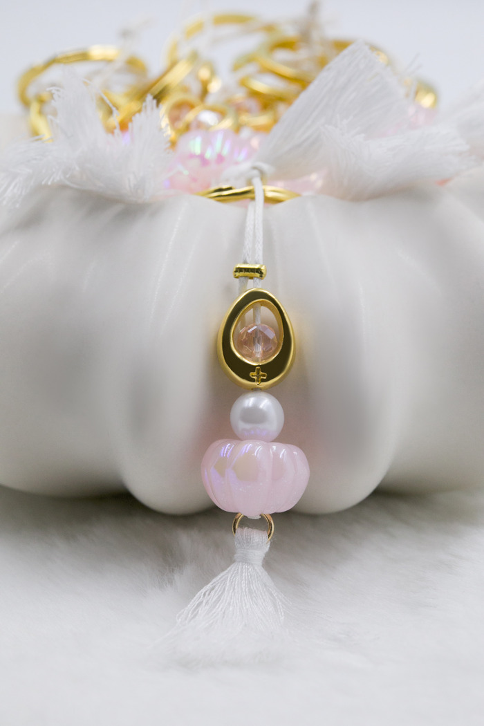 Μαρτυρικό μπρελόκ με λευκή φούντα, ροζ κολοκύθα και επιχρυσωμένο σταυρό.