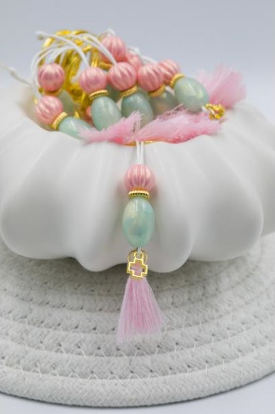 Μαρτυρικό μπρελόκ με ροζ χάντρα και βεραμάν, φούντα ροζ και χρυσό σταυρό.