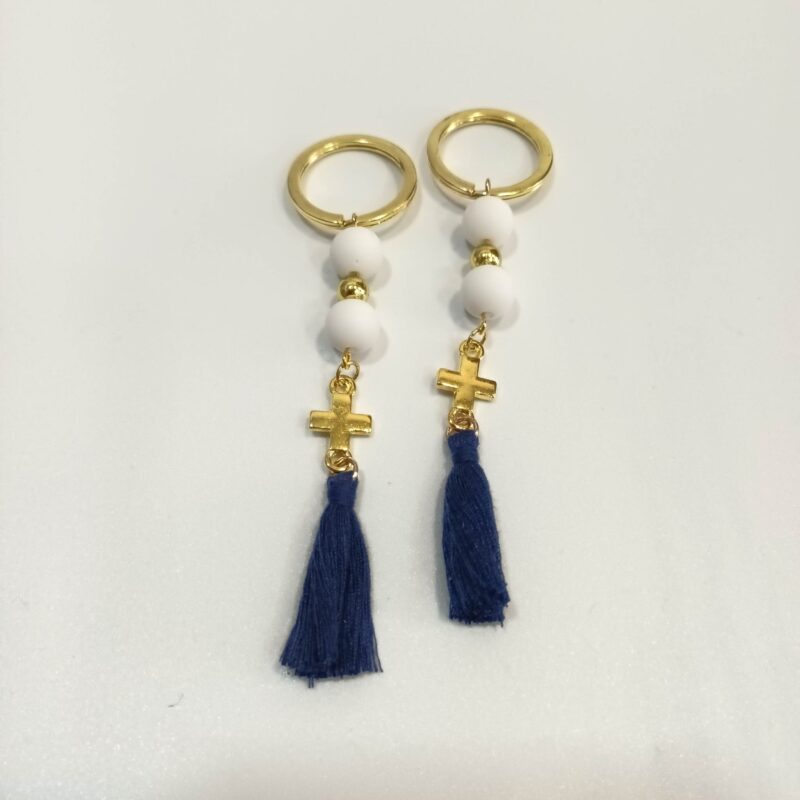 Χειροποίητα μαρτυρικά βάπτισης μπρελόκ με άσπρες και χρυσές χάντρες , χρυσό σταυρό και μπλε φούντα