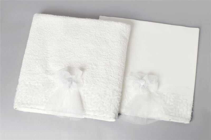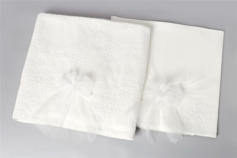 Άσπρο λαδόπανο με μεγάλη φάσα άσπρη δαντέλα με ραμμένο φιόγκο και λουλούδι 112820