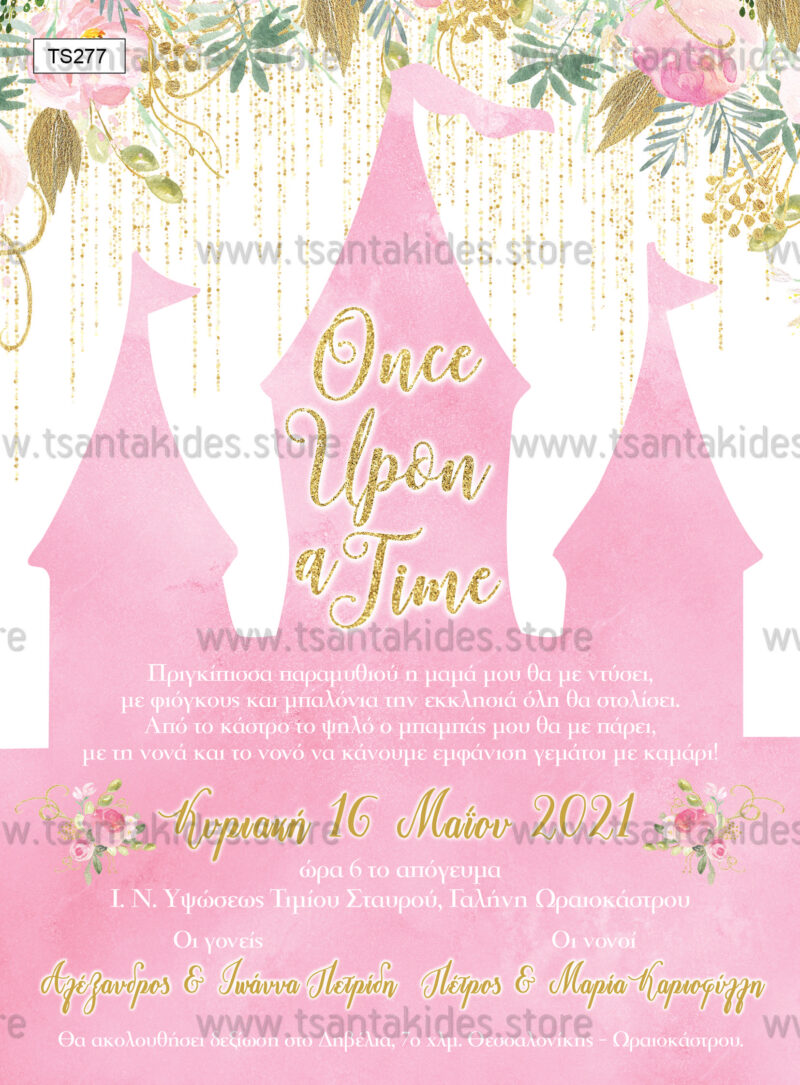 Προσκλητήριο βάπτισης για κορίτσι με θέμα princess και κάστρο TS277
