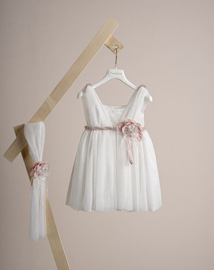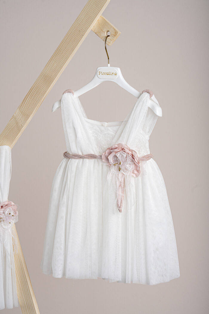 Βαπτιστικό φόρεμα Piccolino Lydia Pink .Φόρεμα σε αρχαιοελληνικό στυλ, με μπούστο από δαντέλα και σχέδιο από τούλι που ξεκινά από τους ώμους και καταλήγει στη μέση, με ζωνάκι πλεξούδα σε ροζ απόχρωση και τούλινη φούστα. Το ντεκόρ του φορέματος αποτελείται από εντυπωσιακό χειροποίητο λουλούδι με δαντέλα και μαραμπού . Το φόρεμα συνοδεύεται από μπαντάνα με ντεκόρ όμοιο με το φόρεμα.