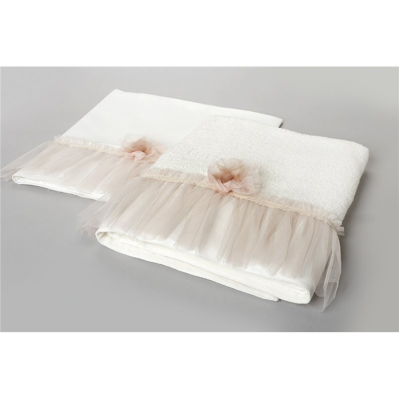 Εκρού σεντόνι με μια μεγάλη φάσα από μπεζ τούλι διαστάσεων 1,40m x 1,00m. Πάνω στη φάσα είναι ραμμένο ένα τούλινο λουλούδι.