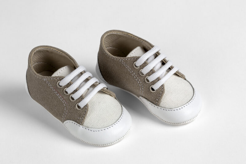 Παπουτσάκι αγκαλιάς sneaker σε λευκό δέρμα, μπεζ και λευκό ύφασμα.