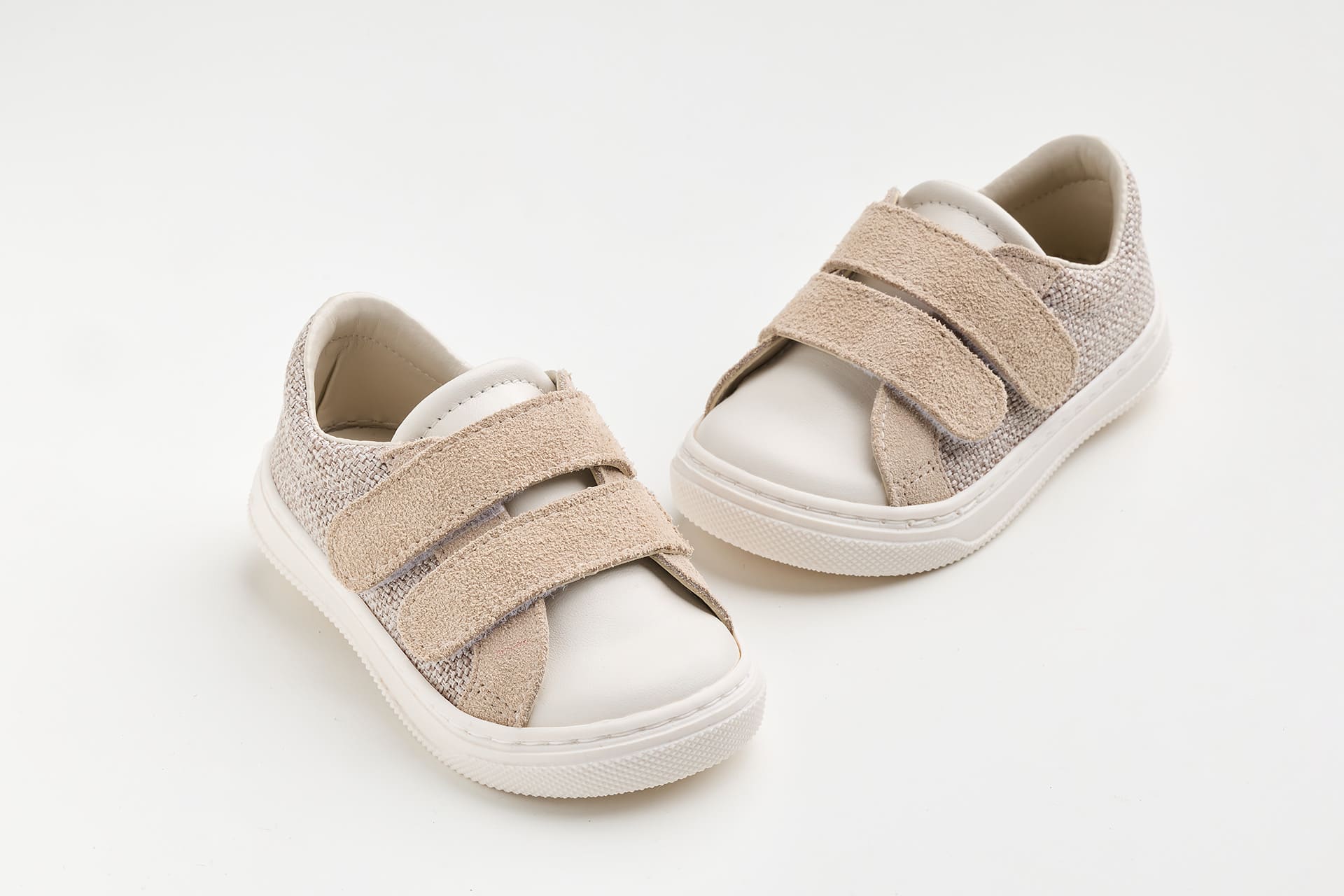 Παπουτσάκι περπατήματος σε μπεζ ύφασμα, μπεζ καστόρ και λευκό δέρμα.