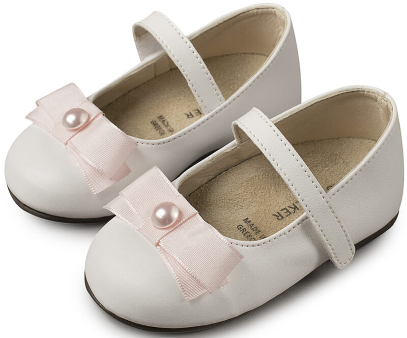 Δερμάτινο γοβάκι μονή μπαρέτα με ταφταδένιο φιόγκο από συνθετικό δέρμα σε λευκό ροζ χρώμα.
