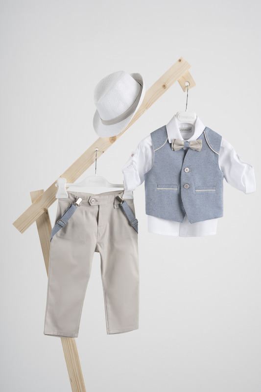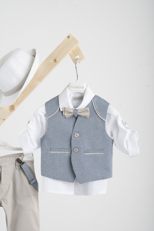 Βαπτιστικό κοστούμι Piccolino Francisco σε χρώμα Blue-Sand. Περιλαμβάνει δίχρωμο γιλέκο με διακοσμητικούς ωμίτες, πουκάμισο βαμβακερό λευκό, παντελόνι βαμβακερό σε χρώμα sand, παπιγιόν με διχρωμία, τιράντες και καπέλο με φάσα.