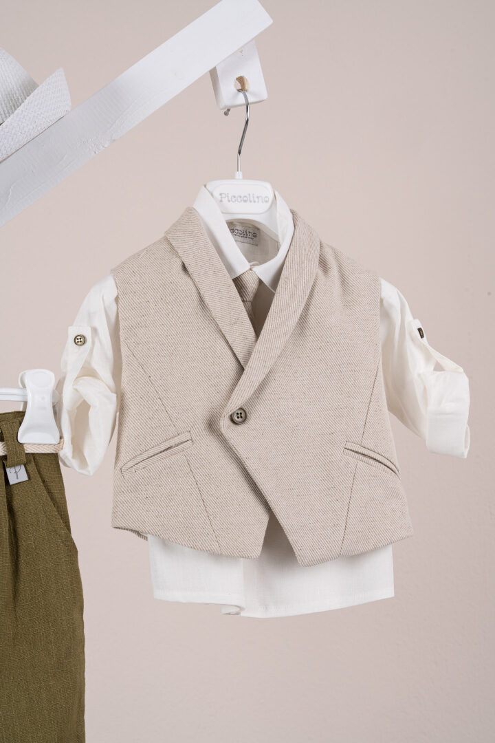 Βαπτιστικό κοστούμι Piccolino Enzo σε χρώμα Golden Olive. Περιλαμβάνει γιλέκο σταυρωτό με μύτη μονόκουμπο, πουκάμισο λινό, παντελόνι λινό με πιέτες σε χρώμα Golden Olive, γραβάτα, φουλάρι λινό με δέσιμο σε ίδια απόχρωση με το παντελόνι, ζωνάκι με double D δέσιμο και καπέλο με φάσα.