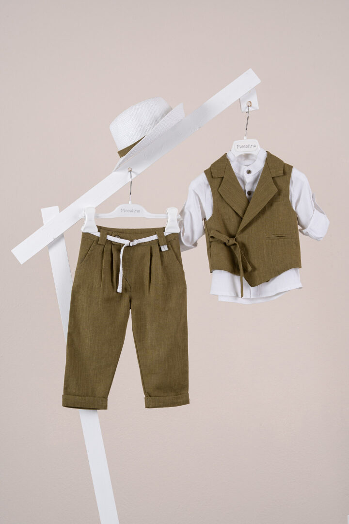 Βαπτιστικό κοστούμι Piccolino Fabio σε χρώμα Golden Olive. Περιλαμβάνει λινό γιλέκο με δέσιμο στο πλάι, πουκάμισο λινό με μάο γιακά, παντελόνι λινό με πιέτες σε χρώμα Golden Olive, ζωνάκι με double D δέσιμο και καπέλο με φάσα.
