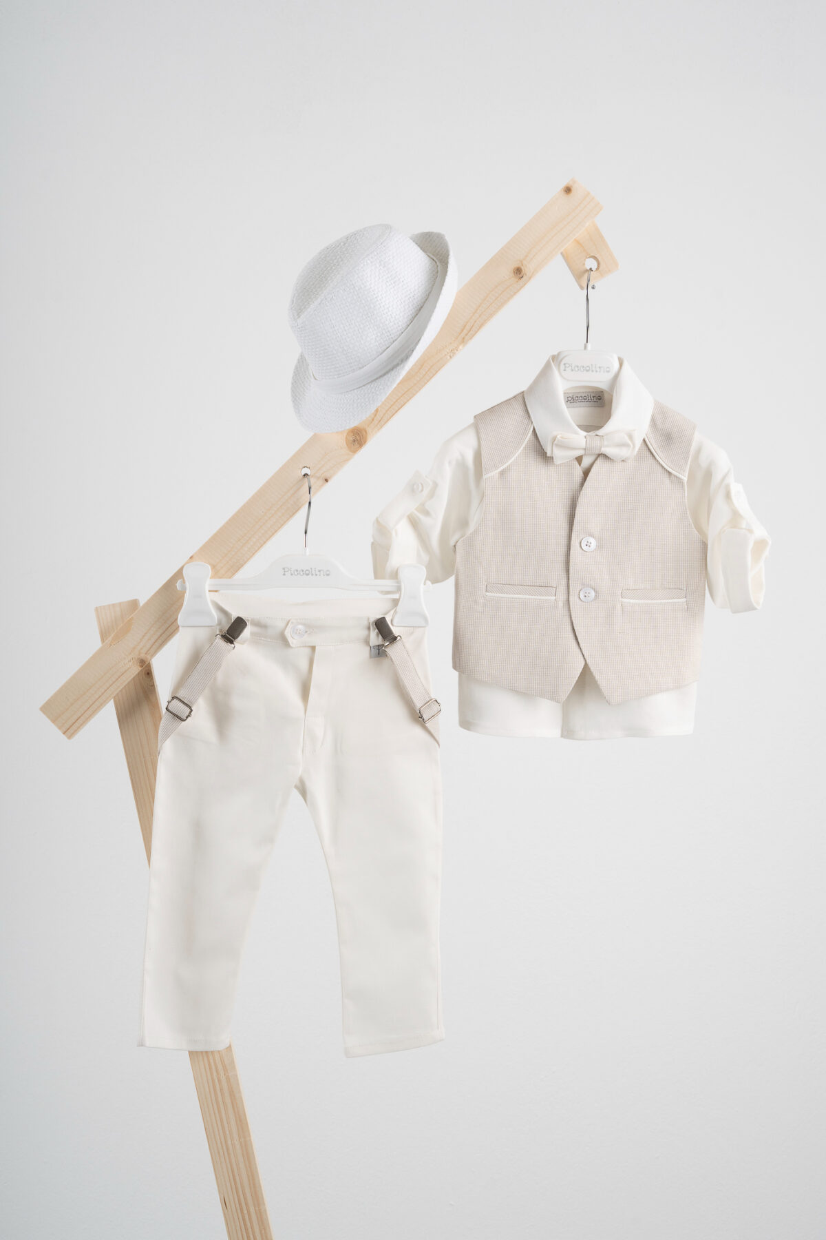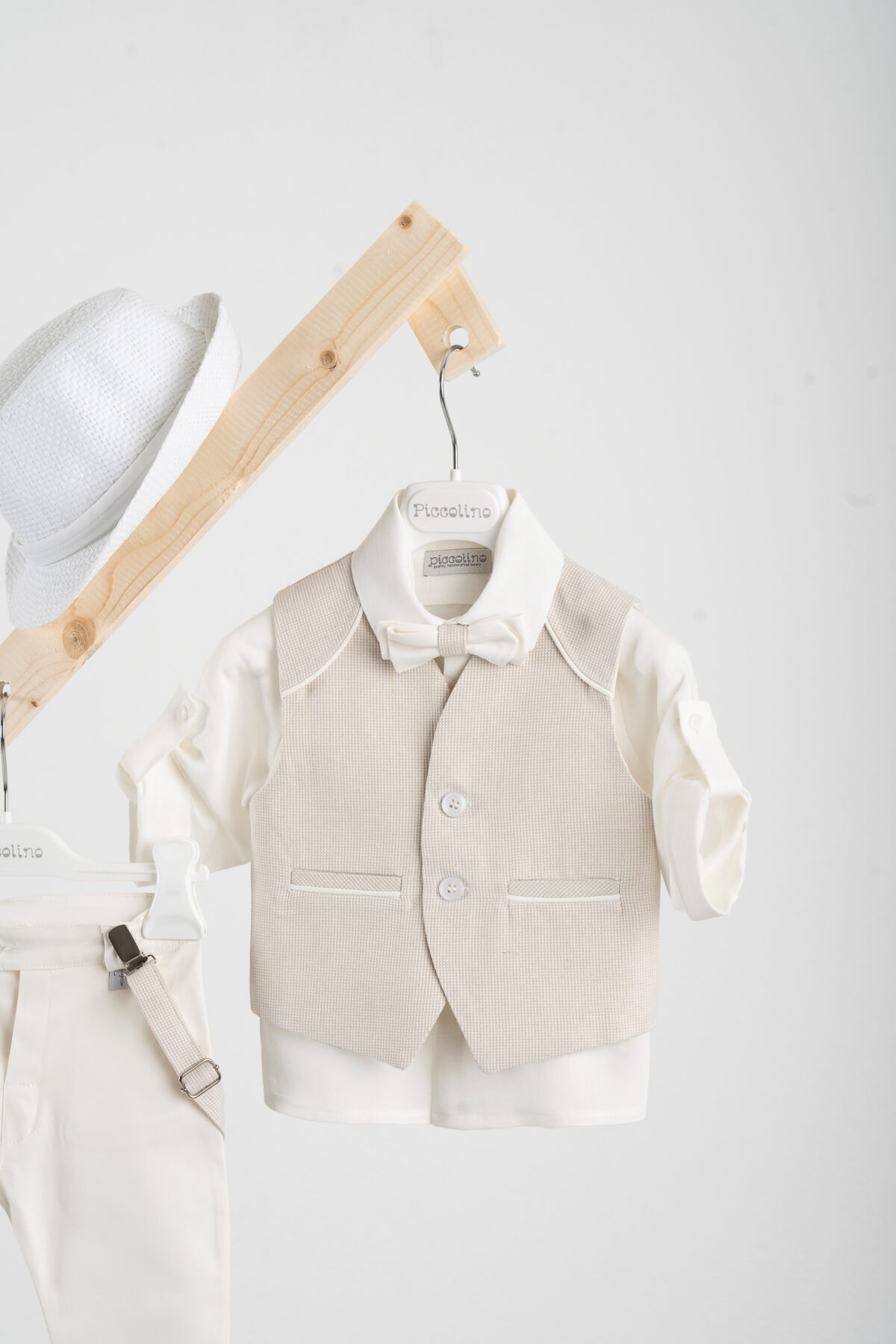 Βαπτιστικό κοστούμι Piccolino Francisco σε χρώμα Ivory. Περιλαμβάνει δίχρωμο γιλέκο με διακοσμητικούς ωμίτες, πουκάμισο λινό εκρού, παντελόνι βαμβακερό σε χρώμα ivory, παπιγιόν με διχρωμία, ζώνη με double D δέσιμο και καπέλο με φάσα.