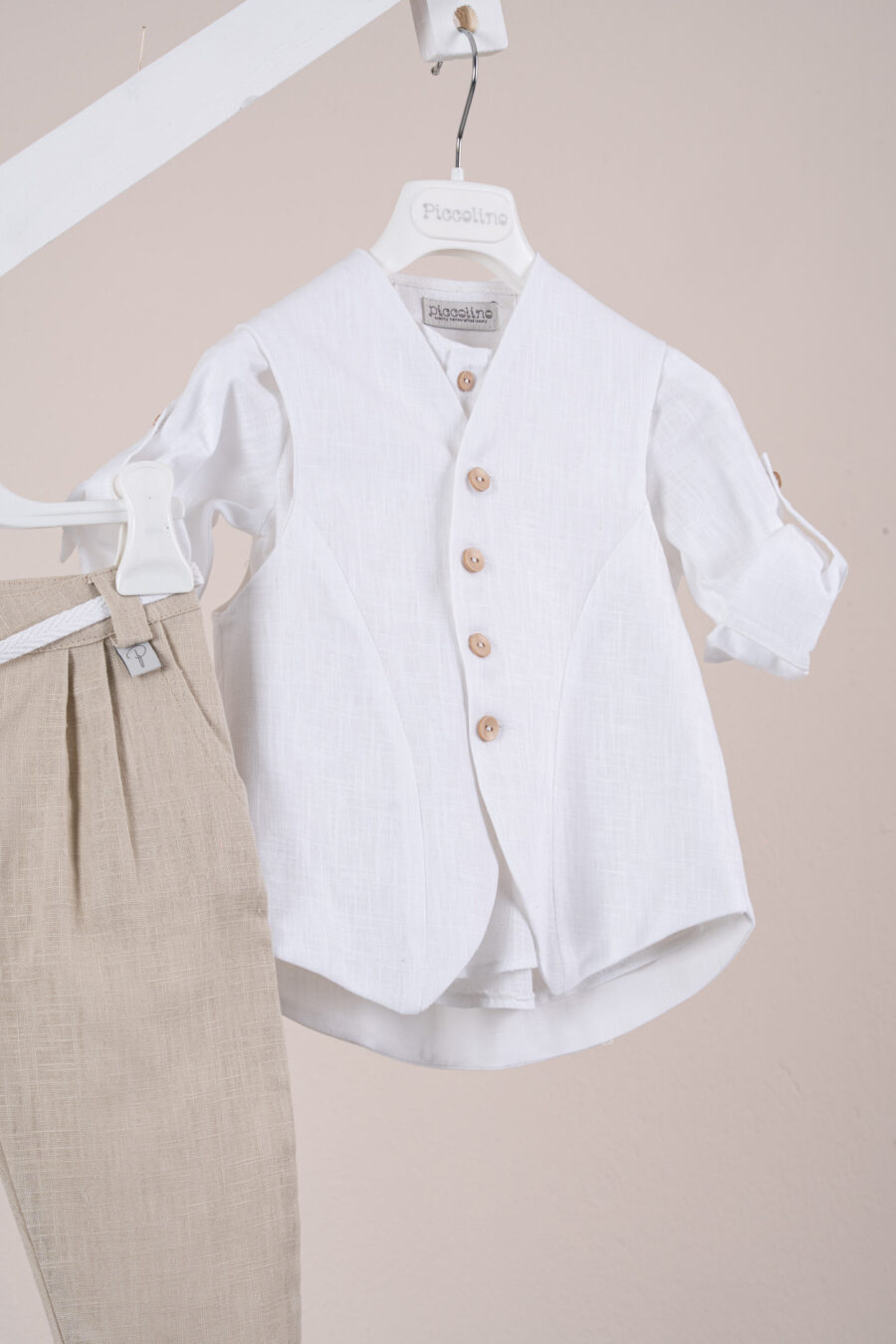 Βαπτιστικό κοστούμι Piccolino Hector σε χρώμα Beige. Περιλαμβάνει καμπυλόγραμμο λινό γιλέκο με κουφόπιετα στην πίσω πλευρά , λινή πουκαμίσα, παντελόνι λινό με πιέτες σε χρώμα Beige και ζωνάκι με double D δέσιμο και καπέλο με φάσα.