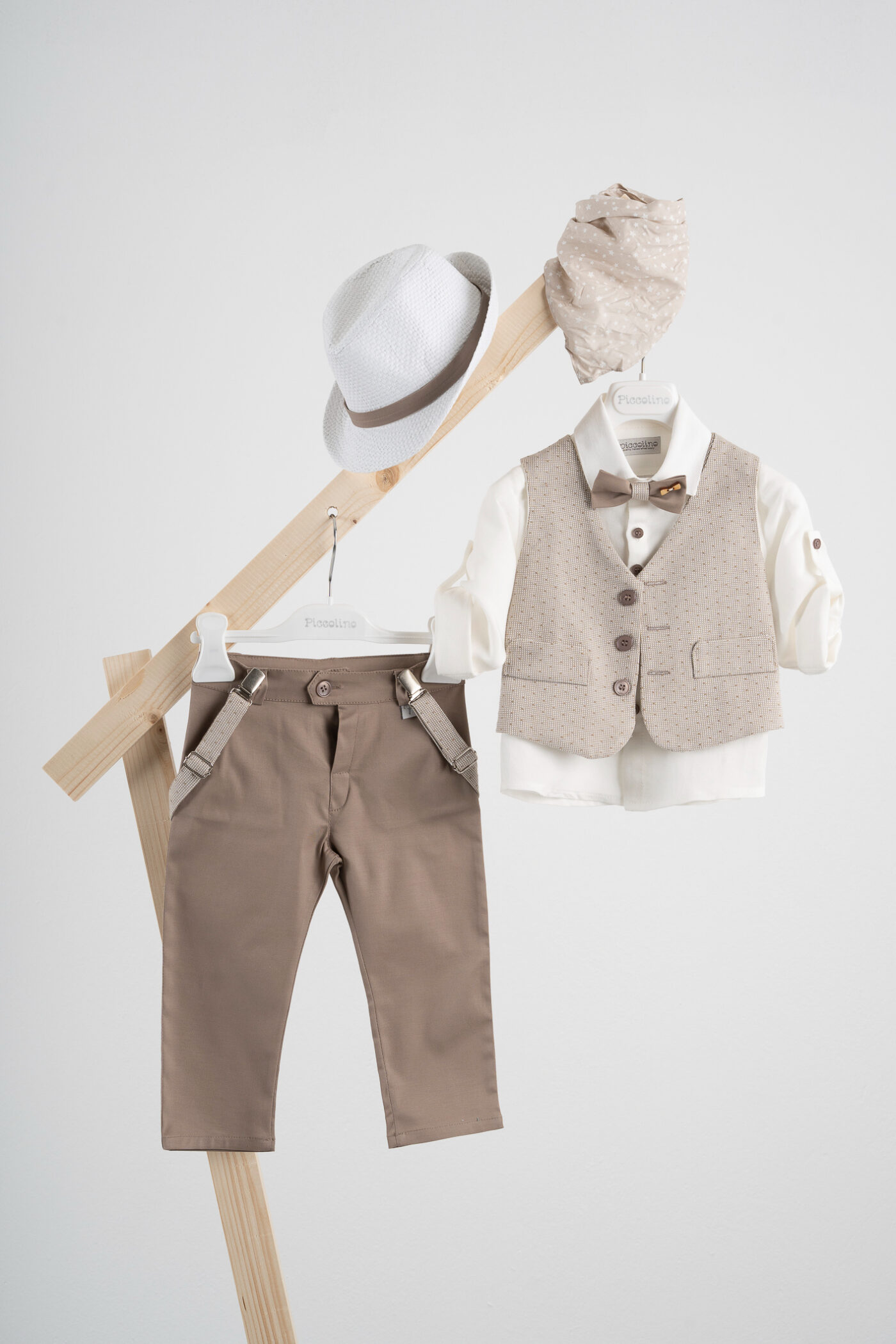 Βαπτιστικό κοστούμι Piccolino Pablo σε χρώμα Mocha. Περιλαμβάνει γιλέκο μπεζ-σοκολά με λεπτομέρειες πουά, πουκάμισο λινό, παντελόνι βαμβακερό σε χρώμα mocha, παπιγιόν με ξύλινη λεπτομέρεια, τιράντες και καπέλο με φάσα.