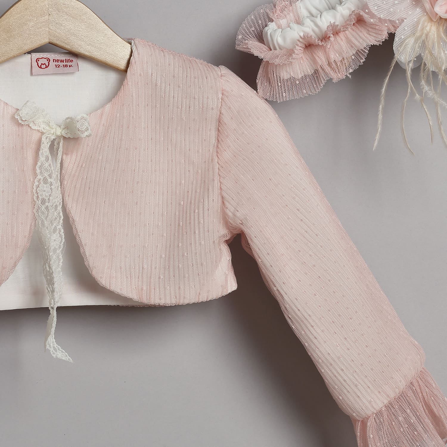Ζακετάκι από πλισέ πουά τούλι σε σάπιο μήλο χρώμα, επενδυμένο με βαμβακερή φόδρα, με δυο ραμμένα δαντελάκια που χρησιμοποιούνται για το δέσιμο.