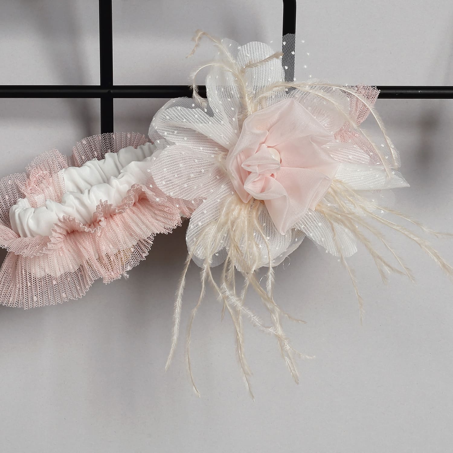 Κορδέλα από πλισέ πουά τούλι σε σάπιο μήλο χρώμα στολισμένη με λουλούδι από μουσελίνα και τούλι με ραμμένα πούπουλα.