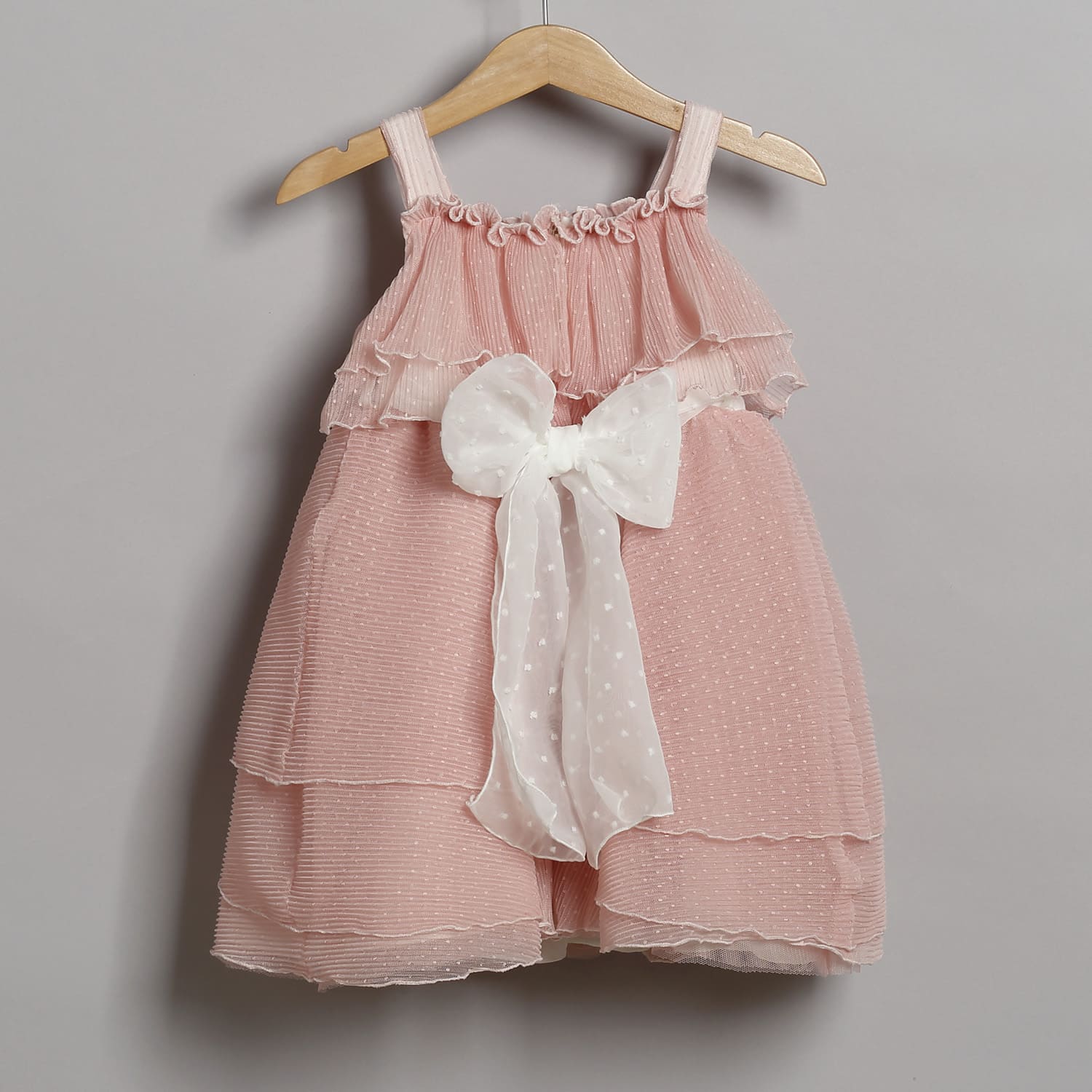 Φόρεμα από πλισέ πουά τούλι σε σάπιο μήλο χρώμα. Από μέσα υπάρχει δεύτερη φούστα από εκρού τούλι. Στο εσωτερικό του φορέματος υπάρχει βαμβακερή φόδρα. Ο στολισμός αποτελείται από μια ζώνη από εκρού μουσελίνα που σχηματίζει φιόγκο στο πίσω μέρος. Μπροστά υπάρχει ένα λουλούδι από μουσελίνα και τούλι με πέρλα στο εσωτερικό του και ραμμένα πούπουλα.