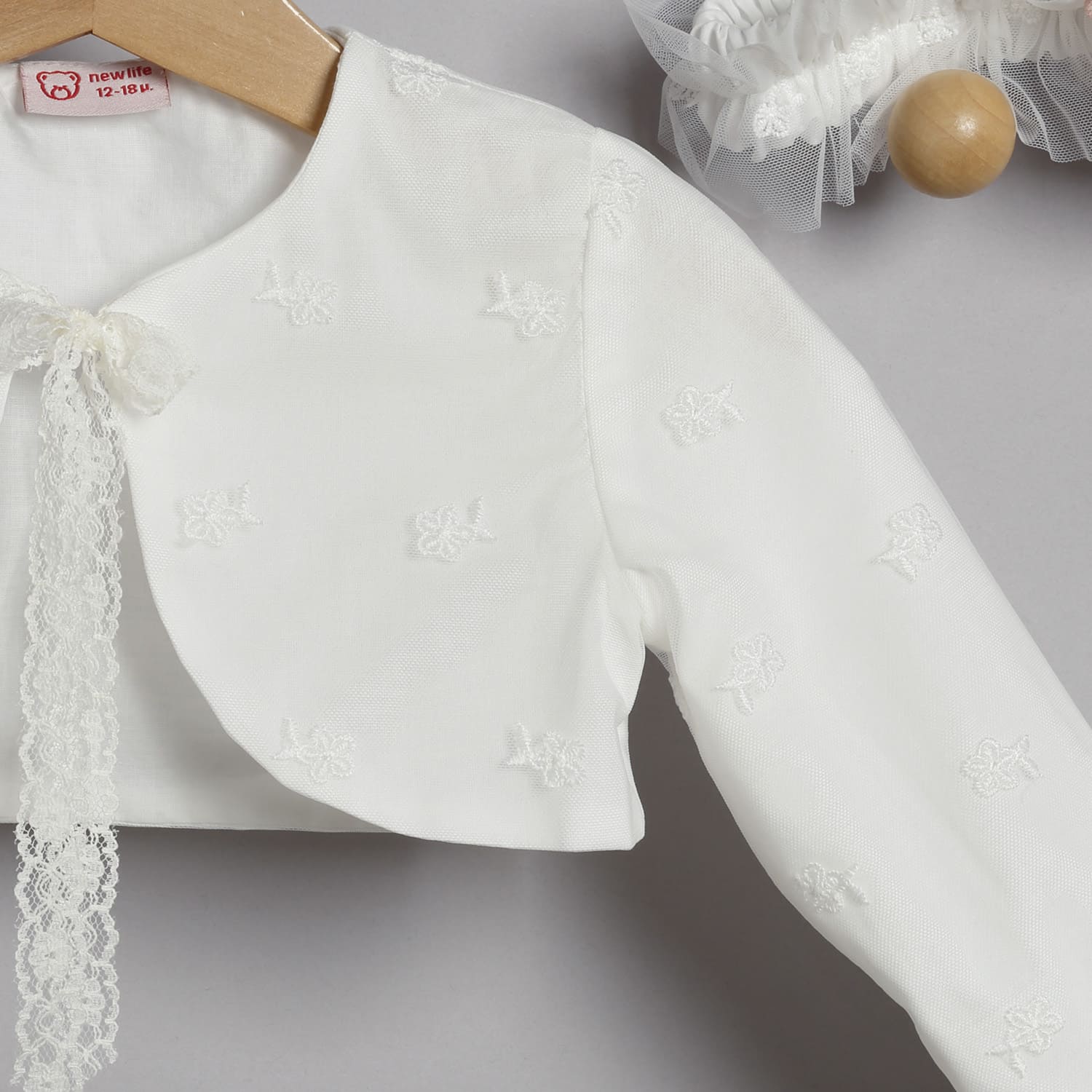 Ζακετάκι από τούλινη δαντέλα σε εκρού χρώμα, επενδυμένο με βαμβακερή φόδρα με δυο κορδελάκια που χρησιμοποιούνται για το δέσιμο.