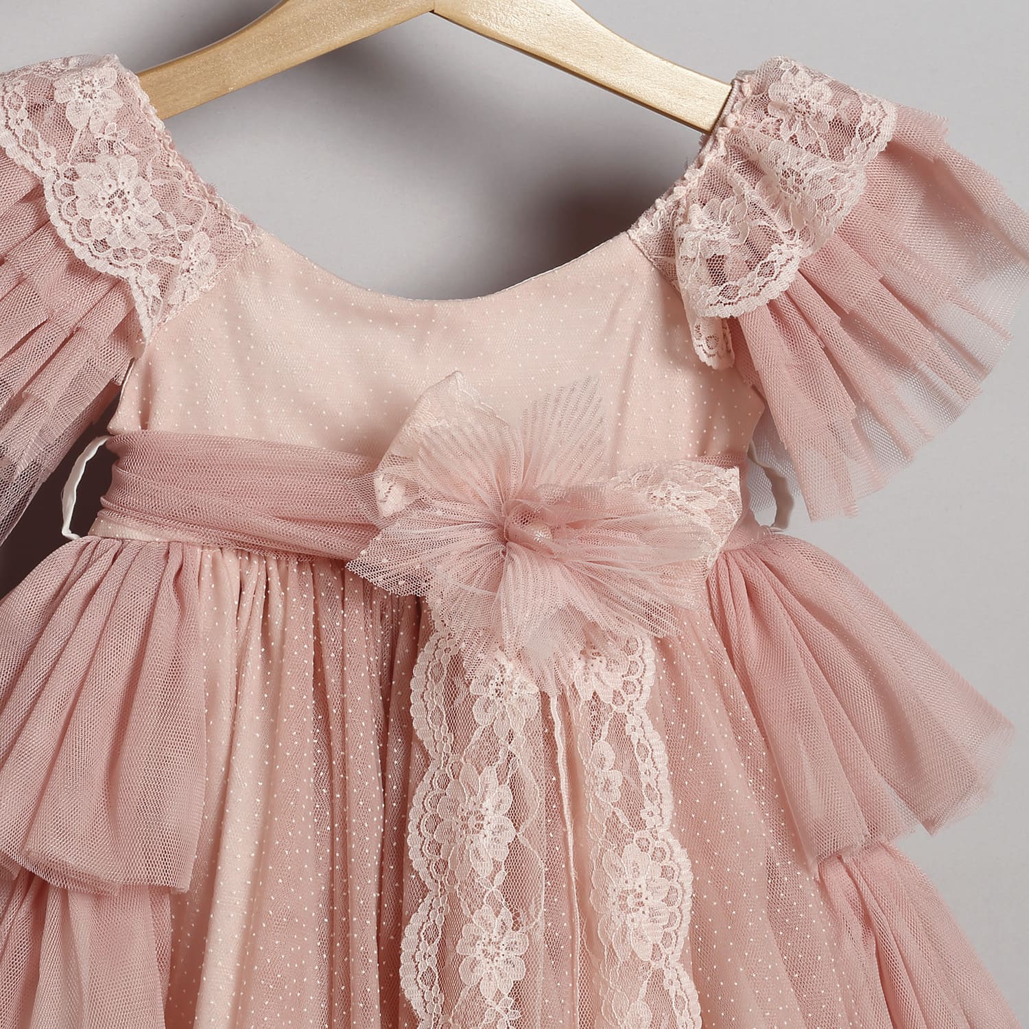 Φόρεμα από σάπιο μήλο πουά τούλι στολισμένο με τούλινη ζώνη, λουλούδι και δαντελάκια.
