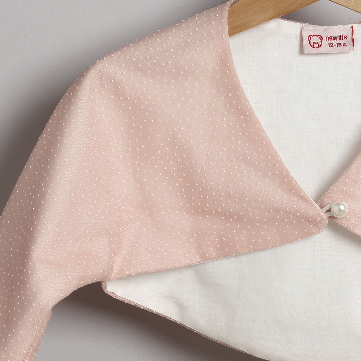Ζακετάκι από πουά τούλι σε σάπιο μήλο χρώμα, επενδυμένο με βαμβακερή φόδρα με ένα κουμπί πέρλα που χρησιμοποιείται για το κλείσιμο.