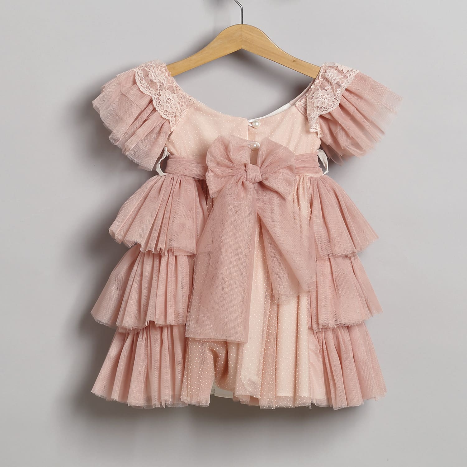 Φόρεμα από πουά τούλι σε σάπιο μήλο χρώμα. Στο εσωτερικό του φορέματος υπάρχει βαμβακερή φόδρα. Ο στολισμός αποτελείται από μια τούλινη ζώνη η οποία σχηματίζει φιόγκο στο πίσω μέρος. Μπροστά υπάρχει ένα λουλούδι από πλισέ τούλι και τούλι, με μια πέρλα στο εσωτερικό του, το οποίο είναι ραμμένο πάνω στη ζώνη μαζί με κρεμαστά δαντελάκια.