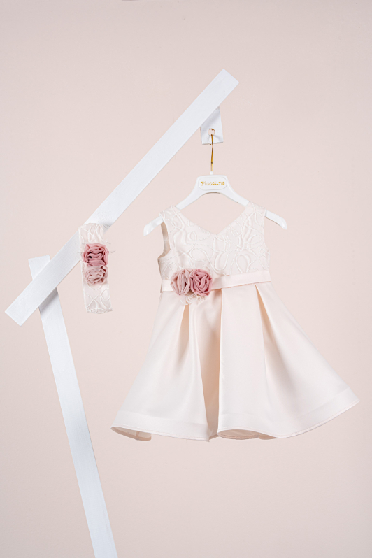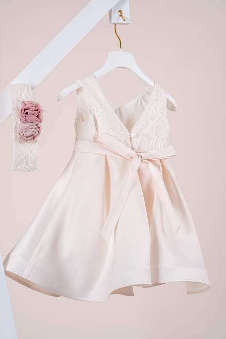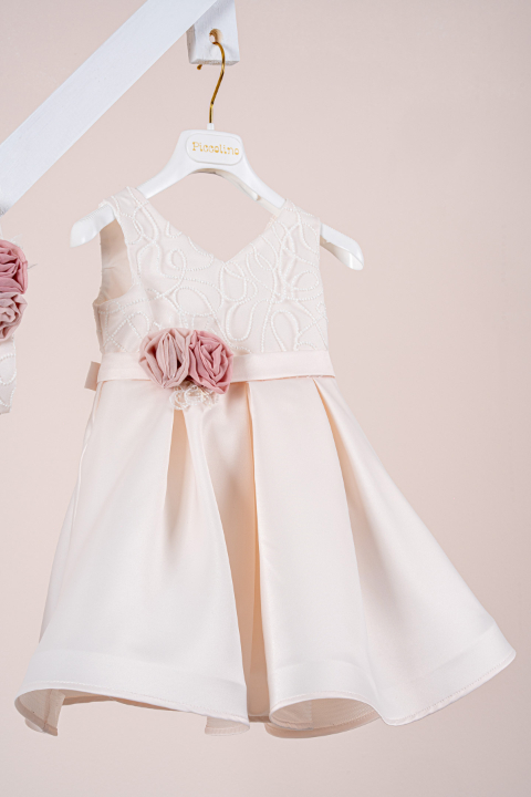 Βαπτιστικό φόρεμα Piccolino Carolina Champagne. Ένα εντυπωσιακό chic φόρεμα από σατέν ύφασμα. Μπούστο με λαιμόκοψη σε σχήμα καρδιάς και επίστρωση λαμπερής δαντέλας με γκλίτερ. Φούστα από σατέν ύφασμα που σχηματίζει πιέτες κάνοντας το φόρεμα μοναδικά ξεχωριστό. Το ντεκόρ του φορέματος αποτελείται από σατέν ζωνάκι και σύνθεση με χειροποίητα λουλούδια. Το φόρεμα συνοδεύεται από κορδέλα με ντεκόρ όμοιο με το φόρεμα.
