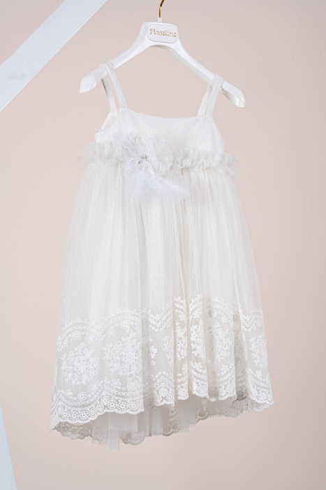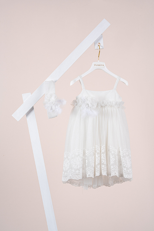 Βαπτιστικό φόρεμα Piccolino Philippa Ivory. Λαμπερό σε ριχτή γραμμή με τιραντάκι φόρεμα από τούλι με γκλίτερ. Η ασύμμετρη φούστα από τούλι γκλίτερ με την επίστρωση δαντέλας στο τελείωμα της καθώς και το περίτεχνο με σούρα ένωμα του πάνω μέρους με την φούστα, κάνοντας το να μοιάζει με ζωνάκι, καθιστούν το φόρεμα ακόμη πιο εντυπωσιακό. Το ντεκόρ του φορέματος αποτελείται από χειροποίητο λουλούδι και πούπουλα. Το φόρεμα συνοδεύεται από κορδέλα με ντεκόρ όμοιο με το φόρεμα.
