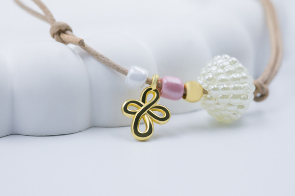 Μαρτυρικό βραχιόλι δέρμα μπεζ, πέρλα, χάντρες λευκές σάπιο μήλο και επιχρυσωμένος σταυρός.