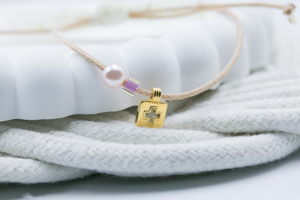 Μαρτυρικό βραχιόλι πέρλα, χάντρα miyuki ροζ χρώμα και επιχρυσωμένος σταυρός σε σχήμα τετράγωνο, κλείσιμο φιόγκος τούλι εκρού.