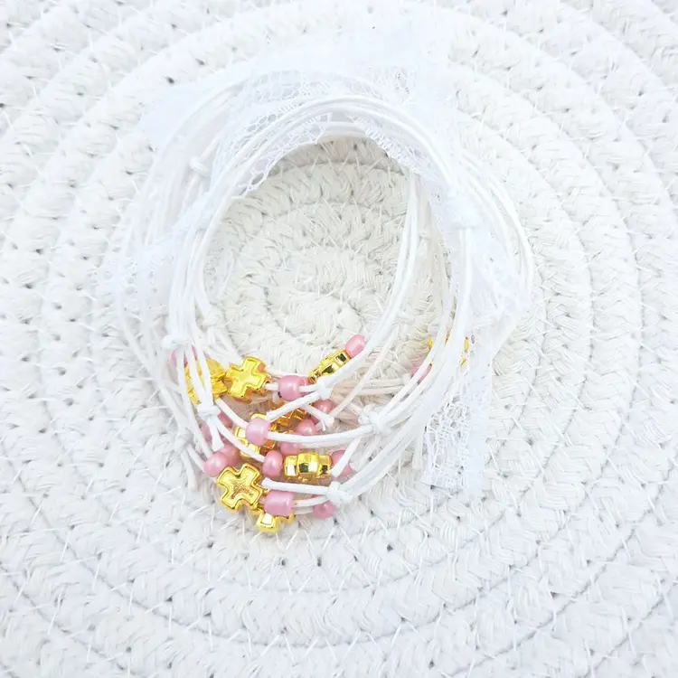 Μαρτυρικό βραχιόλι βάπτισης με άσπρο κορδόνι, δαντέλα ,σάπιο μήλο χάντρες και χρυσό χρώμα σταυρό.