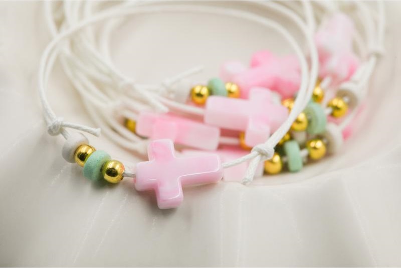 Μαρτυρικό βραχιόλι λευκό κορδόνι με κεραμικές χάντρες και σταυρός με νερά ροζ-λευκό.
