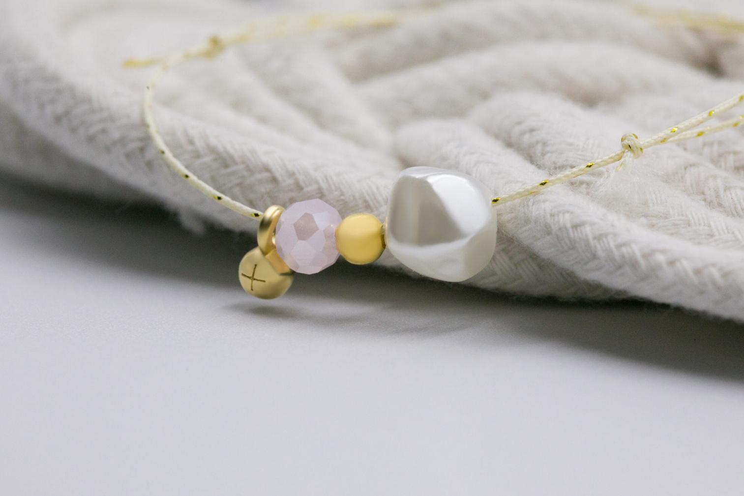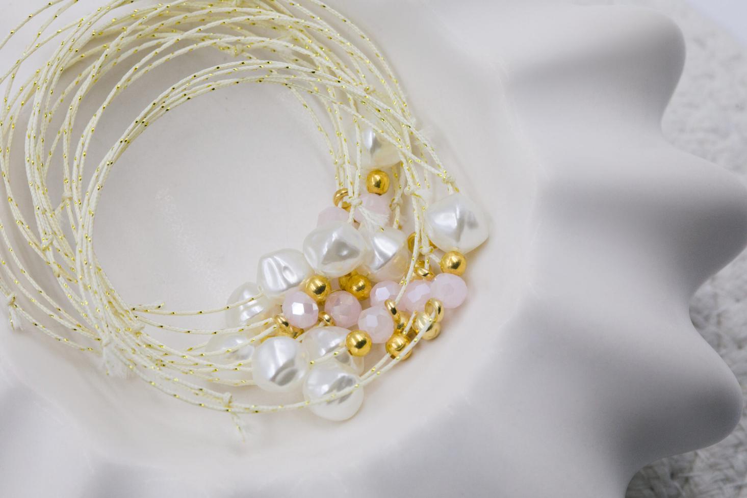 Μαρτυρικό βραχιόλι εκρού κορδόνι πέρλα κρύσταλλο ροζ και επιχρυσωμένος σταυρός.