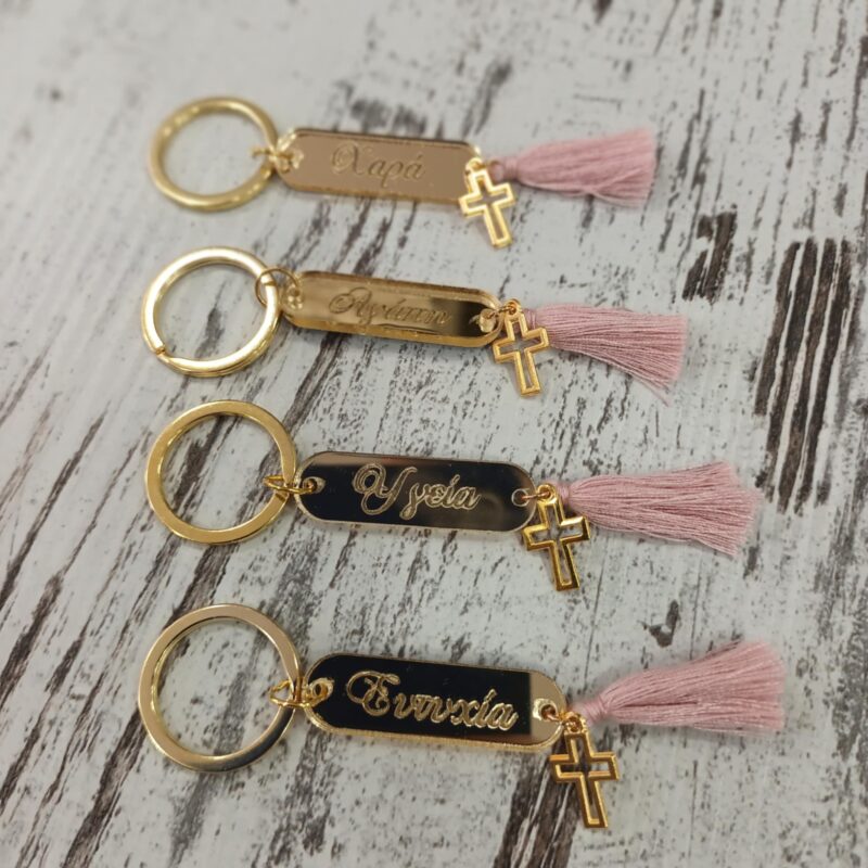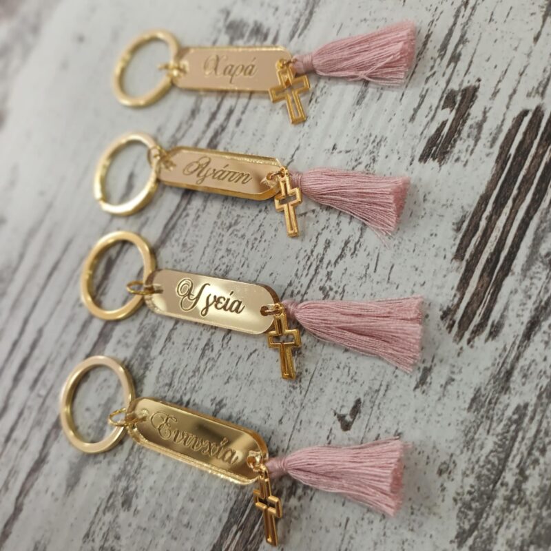 Χειροποίητα μαρτυρικά βάπτισης μπρελόκ με χαραγμένες ευχές σε χρυσό plexiglass με χρυσό χρώμα σταυρό και σάπιο μήλο φουντίτσα . (Υπάρχει η δυνατότητα αλλαγής χρώματος. Σημειώστε στα σχόλια της παραγγελίας σας εαν επιθυμείτε κάποιο άλλο χρώμα στην φουντίτσα).