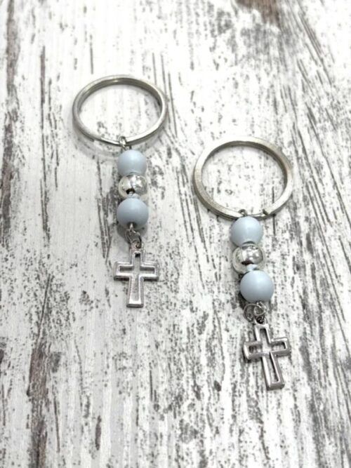 Χειροποίητα μαρτυρικά βάπτισης μπρελόκ με ασημί χρώμα σταυρουδάκι και ασημί με γαλάζιες χάντρες.