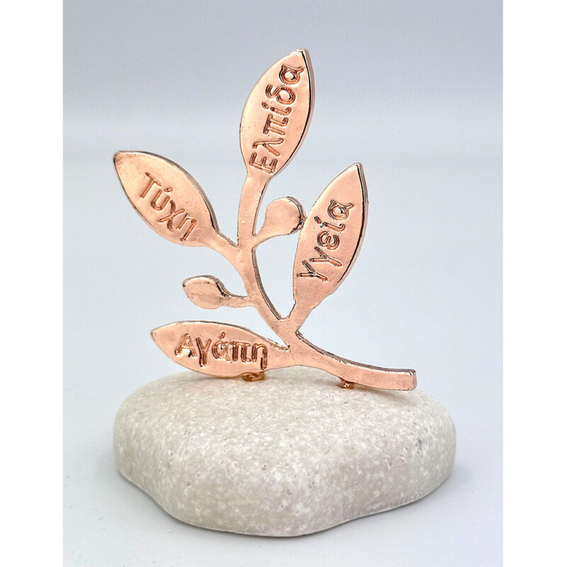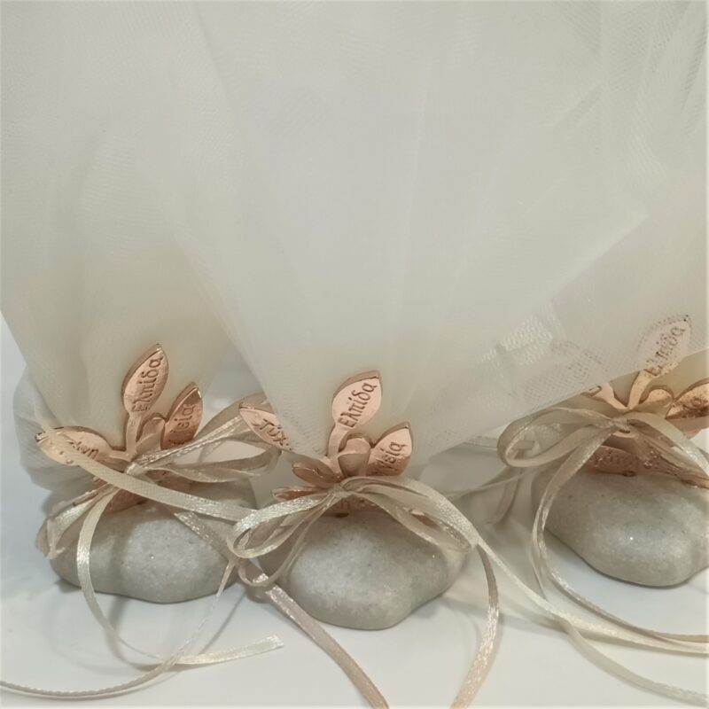 Μπομπονιέρα βότσαλο με ροζ χρυσό κλαδί ελιάς με ευχές, διπλό εκρού τούλι , εκρού και μπεζ σατέν κορδέλες και 5 λευκά κουφέτα crispy Χατζηγιαννάκη.
