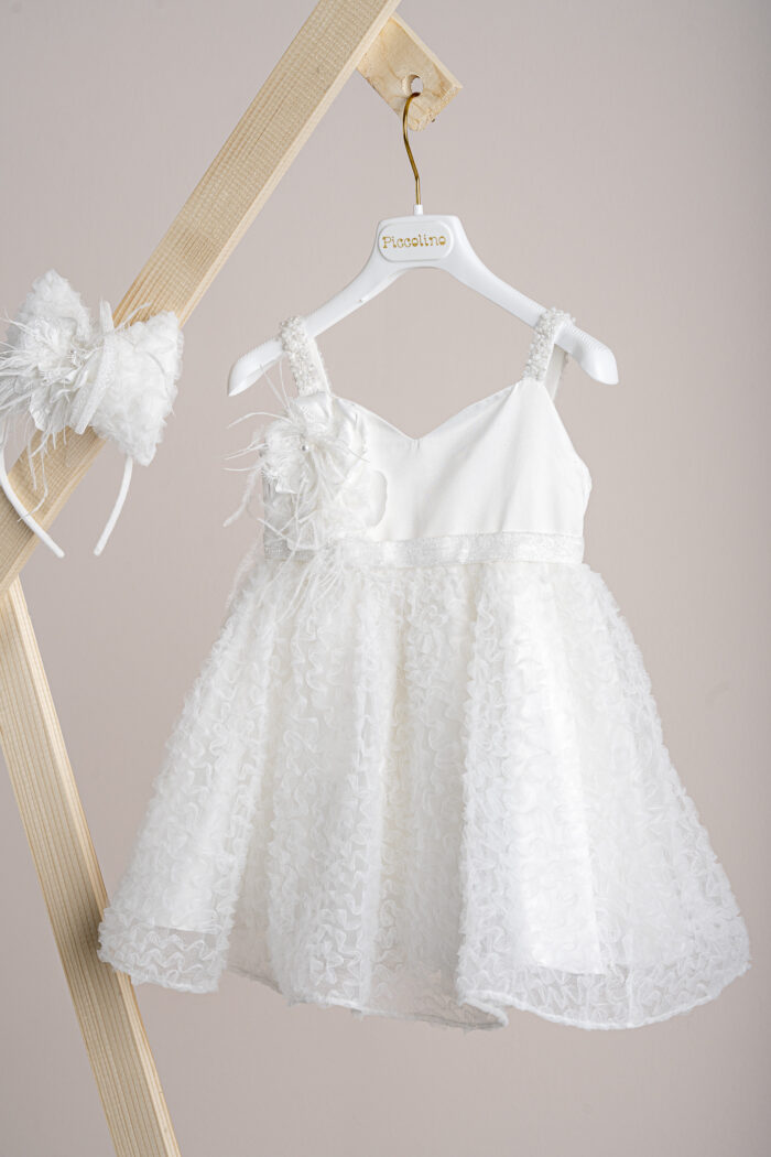 Bαπτισικό φόρεμα Piccolino Emily Ivory. Μπούστο από σατέν σε σχήμα καρδιάς, αστραφτερές τιράντες με στρας και ζωνάκι με γκλίτερ. Εντυπωσιακή φούστα από τούλι με σχέδια . Το ντεκόρ του φορέματος αποτελείται από χειροποίητο λουλούδι και πούπουλα. Το φόρεμα συνοδεύεται από στέκα με ντεκόρ όμοιο με το φόρεμα.